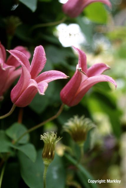 Clematis mit trompeten- förmigen Blüten in Tiefrosa